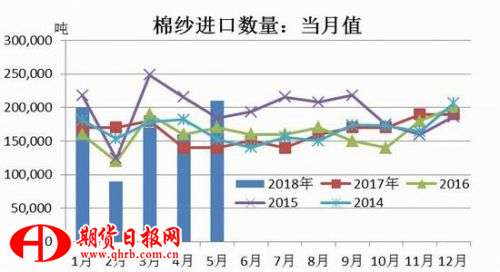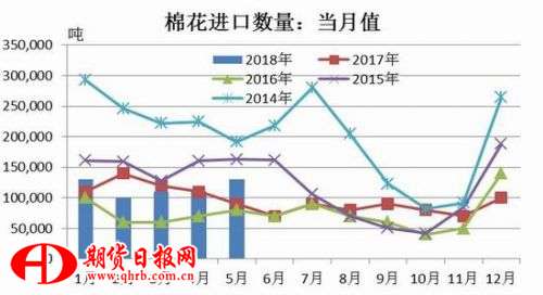 據(jù)海關統(tǒng)計,2018年5月我國進口棉花13萬噸,環(huán)比增加18%,同比增加52%。2018年1-5月我國累計進口棉花58萬噸,同比增加4%。6月14日,國家發(fā)展改革委發(fā)布公告:為保障紡織企業(yè)用棉需要,今年將發(fā)放80萬噸的棉花關稅配額外進口配額。這也是時隔數(shù)年,國家相關部門首次增發(fā)棉花進口滑準稅配額。經(jīng)過近幾年的持續(xù)拋儲,下年度國庫儲備棉量將降至低位區(qū)間,通過進口增加棉花供應量的市場預期增強。本月中美貿(mào)易戰(zhàn)升級,6月15日,美國總統(tǒng)特朗普批準對約500億美元中國產(chǎn)品加征25%關稅。中方隨即宣布對包括棉花在內(nèi)的原產(chǎn)于美國的14類106項商品加征25%的關稅,并于2018年7月6日實施。2017年美棉的進口份額占棉花進口總量的43.8%,中國若提高美國棉花進口關稅25%,將導致美棉進口成本劇增,進口量預計將受到顯著影響。