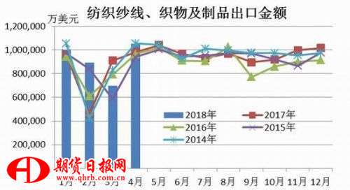 進入6月后,紡織行業(yè)逐漸進入淡季,目前下游紗線和坯布開機率均有所下滑,紗線、坯布庫存開始小幅增長,預計后期疊加環(huán)保等因素影響,紡織服裝訂單也將有所收縮。外需方面,從海關數(shù)據(jù)來看,2018年5月我國紡織品服裝出口額為234.45億美元,環(huán)比增長9.12%,同比增長0.17%。其中紡織紗線、織物及制品出口額為112.44億美元,同比增長8.06%;服裝及衣著附件出口額為122.01億美元,同比下降6.15%。5月紡織品服裝出口繼續(xù)回升,但從目前情況來看,出口市場的未來仍取決于中美貿(mào)易戰(zhàn)的發(fā)展。6月19日,中國商務部網(wǎng)站發(fā)出消息稱,美方在推出500億美元征稅清單之后,威脅將制定2000億美元征稅清單。如果美國繼續(xù)對中國采取報復性措施,進口中國紡織品和服裝很有可能被列入美國加征關稅的名單,中美貿(mào)易摩擦或?qū)⑹怪袊徔椘贩b出口面臨壓力。