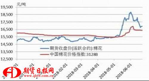 受美國德州天氣和出口銷售向好帶動,ICE棉花期價本月上旬延續(xù)高位震蕩。中旬由于中美貿(mào)易緊張局勢加劇,ICE期價持續(xù)下挫。本月國內(nèi)鄭棉在政策引導下,也呈現(xiàn)高位回落走勢,截止6月25日主力1901合約收盤較月初跌1675元/噸,至16975元/噸,月內(nèi)跌幅8.98%。相比于期貨的大幅波動,國內(nèi)現(xiàn)貨價格走勢較為平穩(wěn),截止6月25日,棉花3128B價格指數(shù)為16353元/噸,較月初跌399元/噸。