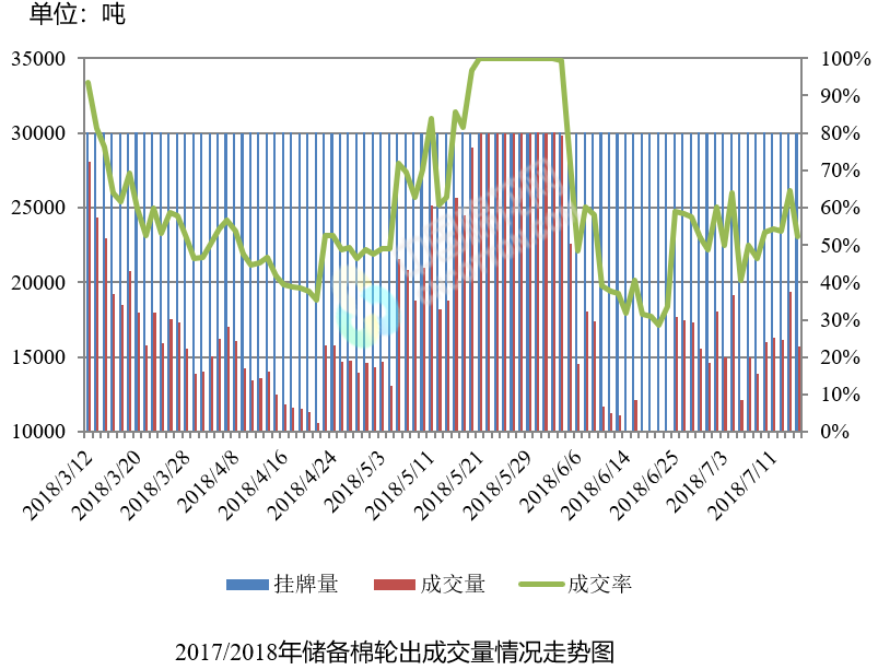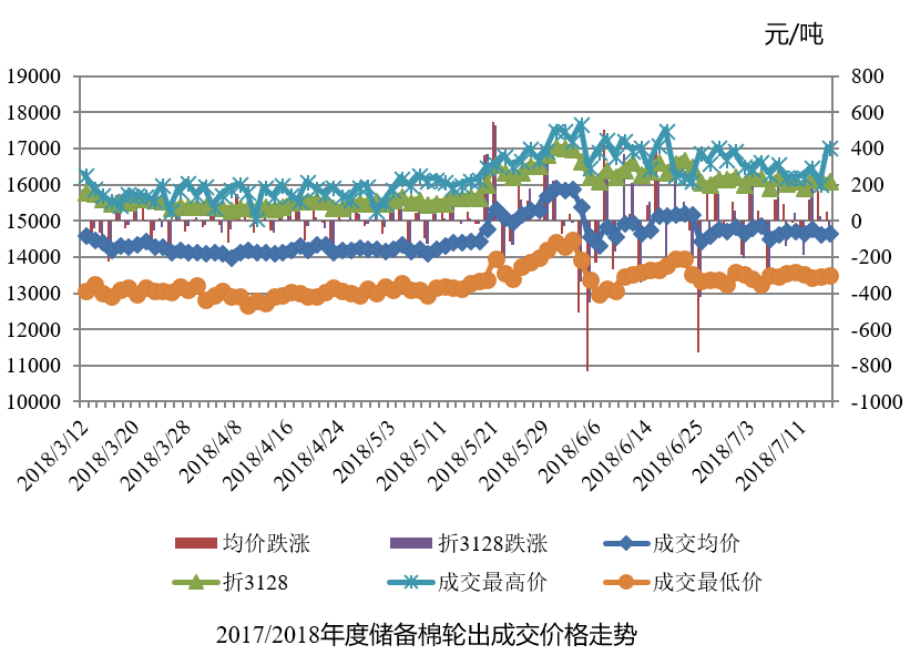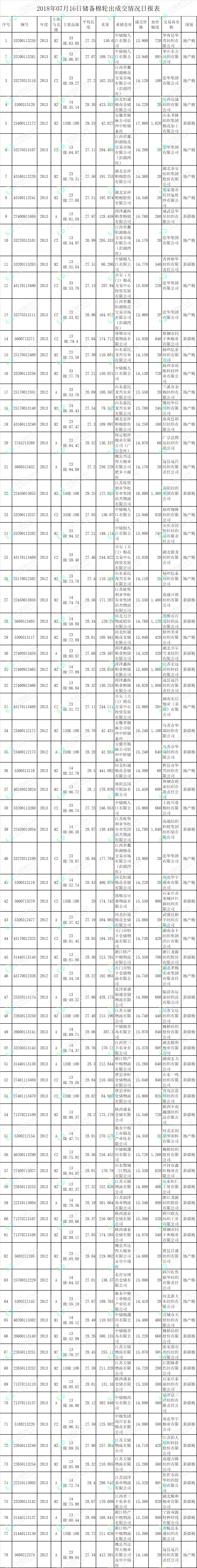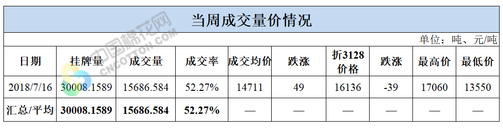 7月16日儲(chǔ)備棉輪出銷(xiāo)售資源30008.1589噸,實(shí)際成交15686.584噸,成交率52.27%。平均成交價(jià)格14711元/噸(較前一日上漲49元/噸);折3128價(jià)格16136元/噸(較前一日下跌39元/噸)。