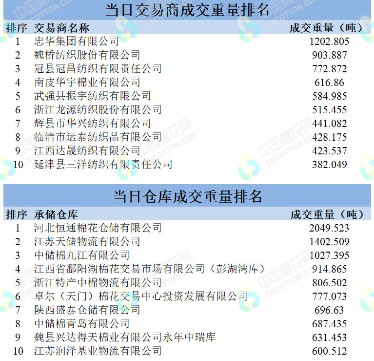 地產(chǎn)棉成交7677.615噸,成交率36%,成交均價(jià)14176元/噸,平均加價(jià)165元/噸,最高成交價(jià)15040元/噸,最低成交價(jià)13550元/噸;新疆棉成交8008.969噸,成交率94%,成交均價(jià)15224元/噸,平均加價(jià)724元/噸,最高成交價(jià)17060元/噸,最低成交價(jià)14520元/噸。