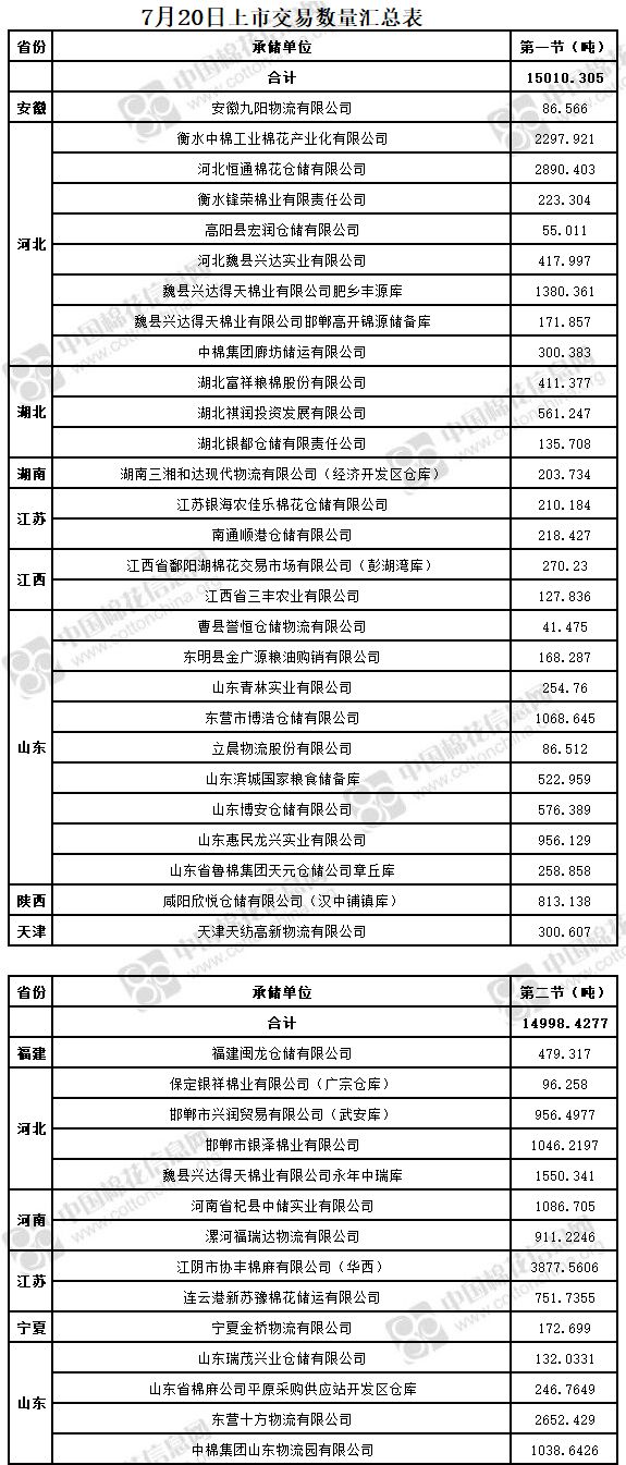 4、保定銀祥棉業(yè)有限公司(廣宗倉庫)、福建閩龍倉儲有限公司、邯鄲市興潤貿(mào)易有限公司(武安庫)、邯鄲市銀澤棉業(yè)有限公司(含有部分包檢)、河南省杞縣中儲實業(yè)有限公司、江陰市協(xié)豐棉麻有限公司(華西)、連云港新蘇豫棉花儲運有限公司、漯河福瑞達物流有限公司、山東瑞茂興業(yè)倉儲有限公司、山東省棉麻公司平原采購供應(yīng)站開發(fā)區(qū)倉庫、中棉集團山東物流園有限公司為實施按批抽樣方式檢驗的承儲庫,由于掛牌較為集中,請買方妥善協(xié)商安排出庫。