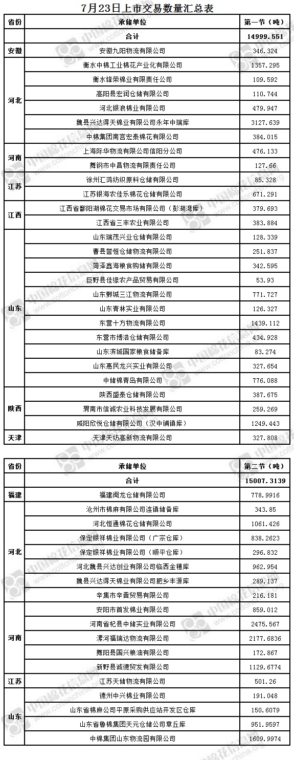 5、保定銀祥棉業(yè)有限公司(廣宗倉庫)、福建閩龍倉儲有限公司、邯鄲市興潤貿易有限公司(武安庫)、邯鄲市銀澤棉業(yè)有限公司(含有部分包檢)、河南省杞縣中儲實業(yè)有限公司、江陰市協(xié)豐棉麻有限公司(華西)、連云港新蘇豫棉花儲運有限公司、漯河福瑞達物流有限公司、山東瑞茂興業(yè)倉儲有限公司、山東省棉麻公司平原采購供應站開發(fā)區(qū)倉庫、中棉集團山東物流園有限公司為實施按批抽樣方式檢驗的承儲庫,由于掛牌較為集中,請買方妥善協(xié)商安排出庫。