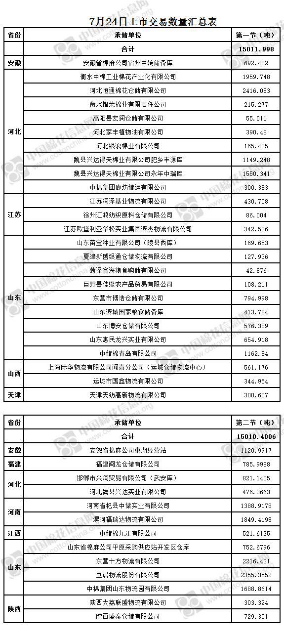 7月24日兩節(jié)共計(jì)輪出儲(chǔ)備棉30022.3986噸。第一節(jié)銷(xiāo)售儲(chǔ)備棉15011.998噸,其中需要倒垛出庫(kù)85捆。第二節(jié)銷(xiāo)售儲(chǔ)備棉15010.4006噸,其中需要倒垛出庫(kù)95捆。