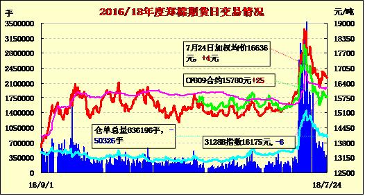 7月24日隔夜鄭棉探低回升后盤整,今日早盤區(qū)間震蕩,午后在空頭回補盤推動下走高,收盤于日高一線,日線形成小陽線。日內(nèi)成交量萎縮,持倉量減少。基本面情況:預(yù)計未來72小時,新疆大范圍高溫的形勢依然延續(xù),也就是說40℃近幾天是家常便飯。按照歐洲中心模式預(yù)報結(jié)果,本周六也就是28日開始,一次大范圍的降水過程光顧新疆,預(yù)計降水范圍和降水強度將出現(xiàn)在下周一(30日),那惱人的熱終于可以暫時消退幾天。