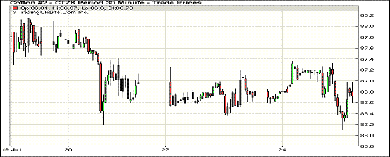 7月24日紐約期棉市場整體收跌。1812合約結(jié)算價86.70美分,跌11點;1903合約結(jié)算價86.69美分,跌8點;1905合約結(jié)算價86.79美分,跌11點。當日12月合約平穩(wěn)開盤,開盤后交易重心受支撐上行,至當日高點87.36美分處小幅回落,圍繞87.20美分一線震蕩運行,后賣盤入場,市場承壓走低,雖在買盤支撐下一度出現(xiàn)小幅回彈,但因上漲動力不足,最終以小幅下跌收盤。12月合約連續(xù)5個交易日下跌,累計跌幅164點。西德州周一夜間出現(xiàn)少量降雨,本周預計仍將有一定概率出現(xiàn)小到中雨天氣。雖然根據(jù)美國農(nóng)業(yè)部最新發(fā)布的數(shù)據(jù)來看,德州棉株生長狀況偏差,但如果本月月底之前出現(xiàn)明顯降雨天氣,將對西德州尤其旱地區(qū)域棉株生長狀況起到改善作用。外圍美元指數(shù)下跌,大豆期貨下跌,玉米和小麥期貨上漲。美股沖高回落,收盤漲跌不一,標普微漲,道指大幅收漲,納指微跌。