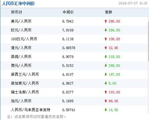據(jù)中國外匯交易中心公布數(shù)據(jù)顯示,7月27日人民幣對美元匯率中間價為6.7942元,下調(diào)280個基點。