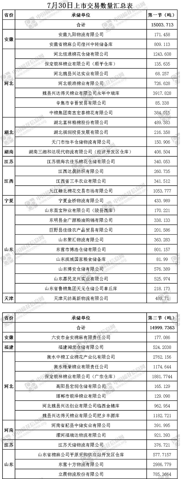 4、福建閩龍倉儲有限公司、河南省杞縣中儲實業(yè)有限公司、漯河福瑞達物流有限公司(含有部分包檢)、山東省棉麻公司平原采購供應(yīng)站開發(fā)區(qū)倉庫、立晨物流股份有限公司、河北魏縣興達實業(yè)有限公司、邯鄲市興潤貿(mào)易有限公司(武安庫)(含有部分包檢)、安徽省棉麻公司巢湖經(jīng)營站、中儲棉九江有限公司、中棉集團山東物流園有限公司為實施按批抽樣方式檢驗的承儲庫,由于掛牌較為集中,請買方妥善協(xié)商安排出庫。