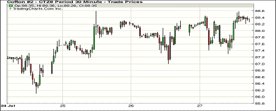 7月27日紐約期棉市場近漲遠跌。1812合約結(jié)算價88.34美分,漲11點;1903合約結(jié)算價88.14美分,漲4點;1905合約結(jié)算價88.14美分,漲6點。12月合約小幅低開,開盤后受支撐交易重心小幅走高,高點處賣盤入場,市場承壓走低,后交易期間再次經(jīng)歷較大幅度震蕩,在上行至當(dāng)日高點88.58美分處多頭獲利平倉,市場小幅走低,后圍繞88.40美分一線窄幅震蕩,最終以小幅上漲收盤。外圍美元指數(shù)下跌,玉米和小麥期貨下跌,大豆期貨上漲。