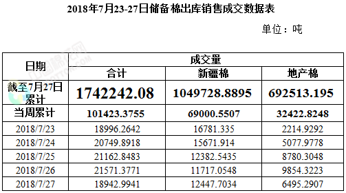 2017/2018年度儲(chǔ)備棉輪出截至7月27日成交量走勢(shì)