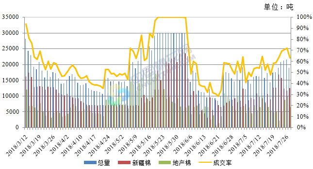 截至2018年7月27日,2017/2018年度儲(chǔ)備棉輪出累計(jì)掛牌291.1萬(wàn)噸,其中新疆棉108.5萬(wàn)噸、地產(chǎn)棉182.6萬(wàn)噸;累計(jì)成交174.2萬(wàn)噸,成交率60%,其中新疆棉成交105萬(wàn)噸,成交率96.8%,地產(chǎn)棉成交69.2萬(wàn)噸,成交率37.9%;累計(jì)成交企業(yè)779家,其中紡織企業(yè)611家,成交113.2萬(wàn)噸;貿(mào)易商168家,成交61萬(wàn)噸。