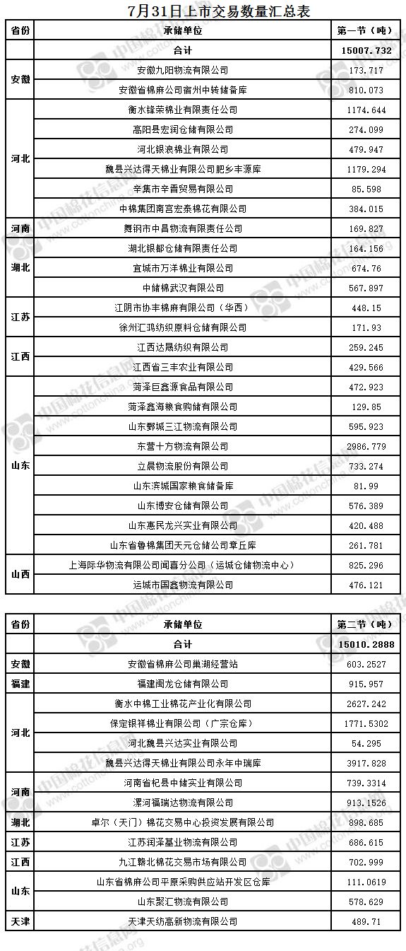 7月31日兩節(jié)共計輪出儲備棉30018.0208噸。第一節(jié)銷售儲備棉15007.732噸,其中需要倒垛出庫83捆。第二節(jié)銷售儲備棉15010.2888噸,其中需要倒垛出庫51捆。