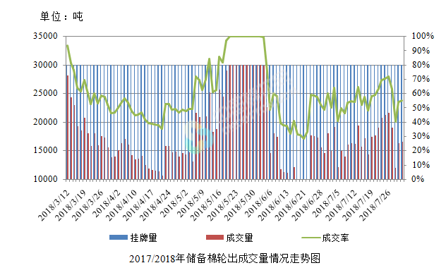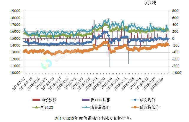8月1日儲(chǔ)備棉輪出銷售資源30008.8081噸,實(shí)際成交16537.0022噸,成交率55.11%。平均成交價(jià)格14929元/噸(較前一日下跌103元/噸);折3128價(jià)格16351元/噸(較前一日下跌25元/噸)。