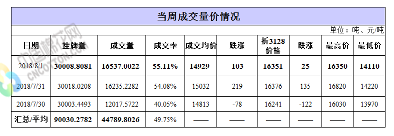 累計(jì)情況:截至8月1日,累計(jì)計(jì)劃出庫300萬噸,累計(jì)出庫成交178.7萬噸,成交率為59.56%;成交最高價(jià)17700元/噸,最低價(jià)12700元/噸。