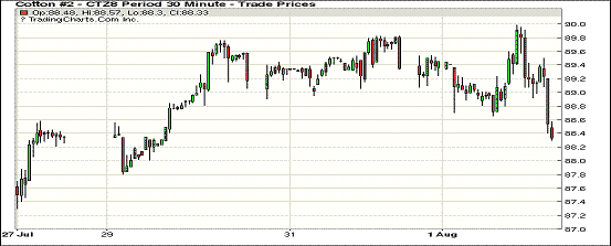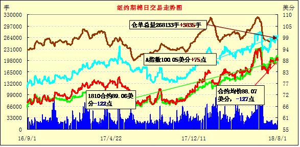 8月第一個(gè)交易日紐約期棉市場(chǎng)結(jié)束5連漲,全面收跌。1812合約結(jié)算價(jià)88.34美分,跌125點(diǎn);1903合約結(jié)算價(jià)88.28美分,跌122點(diǎn);1905合約結(jié)算價(jià)88.37美分,跌102點(diǎn)。其他合約下跌25-95點(diǎn)不等。當(dāng)日12月合約小幅低開(kāi),開(kāi)盤(pán)后因缺乏有力支撐交易重心繼續(xù)走低,后買(mǎi)盤(pán)低點(diǎn)發(fā)力,市場(chǎng)受支撐上行,但不敵賣(mài)盤(pán)施壓迅速回落,后至收盤(pán)維持下行態(tài)勢(shì),最終大幅收跌。美棉出口周報(bào)發(fā)布在即,隨著本年度的結(jié)束,市場(chǎng)都在猜測(cè)未裝運(yùn)部分是否會(huì)結(jié)轉(zhuǎn)至新年度。同時(shí)也普遍擔(dān)憂(yōu)中國(guó)是否會(huì)大量取消。外圍美元指數(shù)上漲,小麥期貨上漲,玉米和大豆期貨下跌。