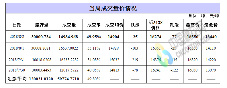 累計情況:截至8月2日,累計計劃出庫303萬噸,累計出庫成交180.2萬噸,成交率為59.46%;成交最高價17700元/噸,最低價12700元/噸。