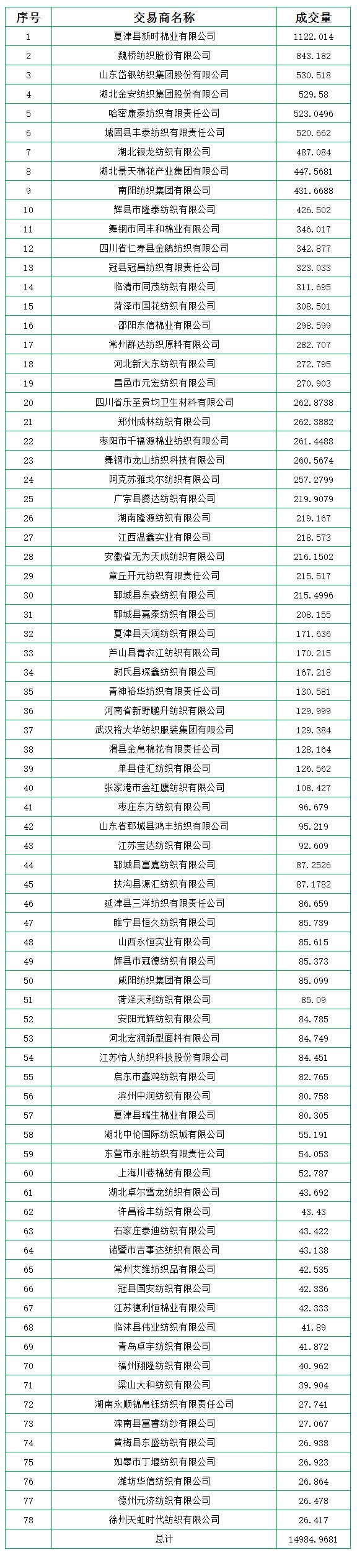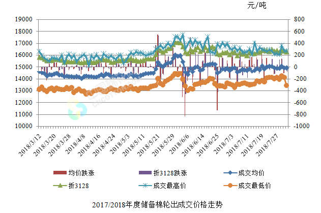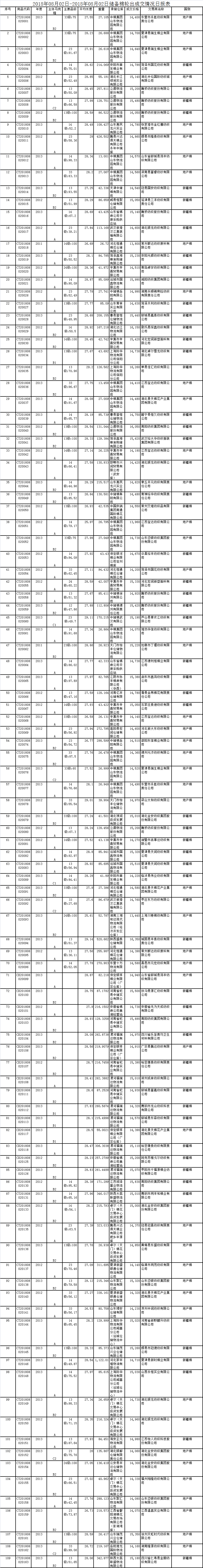 8月2日儲備棉輪出銷售資源30000.7338噸,實際成交14984.9681噸,成交率49.95%。平均成交價格14904元/噸(較前一日下跌25元/噸);折3128價格16274元/噸(較前一日下跌77元/噸)。