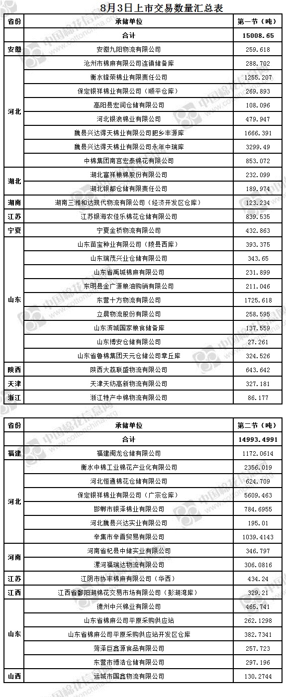 4、福建閩龍倉儲有限公司、河南省杞縣中儲實業(yè)有限公司、漯河福瑞達物流有限公司(含有部分包檢)、山東省棉麻公司平原采購供應(yīng)站開發(fā)區(qū)倉庫、立晨物流股份有限公司、河北魏縣興達實業(yè)有限公司、邯鄲市興潤貿(mào)易有限公司(武安庫)(含有部分包檢)、安徽省棉麻公司巢湖經(jīng)營站、中儲棉九江有限公司、中棉集團山東物流園有限公司為實施按批抽樣方式檢驗的承儲庫,由于掛牌較為集中,請買方妥善協(xié)商安排出庫。