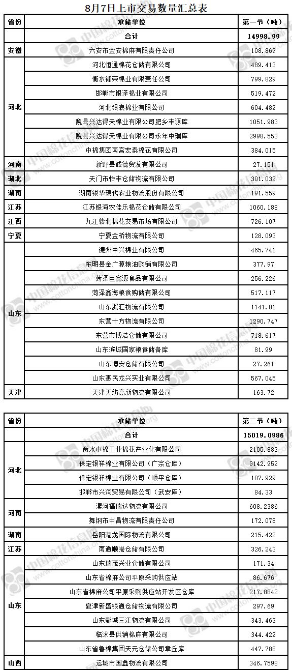 4、漯河福瑞達(dá)物流有限公司、山東省棉麻公司平原采購(gòu)供應(yīng)站、山東省棉麻公司平原采購(gòu)供應(yīng)站開(kāi)發(fā)區(qū)倉(cāng)庫(kù)、運(yùn)城市國(guó)鑫物流有限公司、保定銀祥棉業(yè)有限公司(廣宗倉(cāng)庫(kù))為實(shí)施按批抽樣方式檢驗(yàn)的承儲(chǔ)庫(kù),由于掛牌較為集中,請(qǐng)買(mǎi)方妥善協(xié)商安排出庫(kù)。