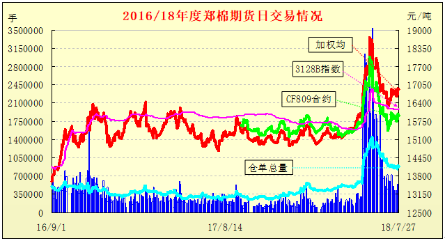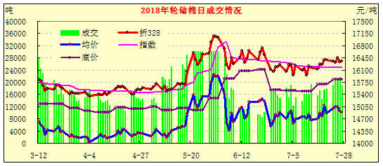 5、紡企競拍儲備棉謹(jǐn)慎,成交平穩(wěn)。3月12日-7月27日4個多月時間,共投放儲備棉291.07萬噸,成交174.7萬噸,成交比60%,低于上年約10個百分點。成交均價14720元/噸,折328均價16024元/噸,與現(xiàn)貨價格基本持平。因5月下旬棉價大幅波動,全國棉花交易市場從6月4日設(shè)紡織專場,禁止棉花經(jīng)營和其他企業(yè)入場。其中自6月4日設(shè)紡織專場以來,成交比例有所下降,成交價格平穩(wěn),平均成交率53.2%,較此前64.6%的成交率下降11.4個百分點,即近半數(shù)流拍,反映紡企拍儲謹(jǐn)慎。隨著紡企用棉庫存逐步下降及對新棉預(yù)期的擔(dān)憂,預(yù)計8月需求增加,成交將有所回升。