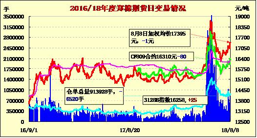 8月8日隔夜鄭棉沖高回落,今日早盤(pán)在空頭回補(bǔ)推動(dòng)下回升,此后區(qū)間震蕩,日線形成小陰線。日內(nèi)成交量萎縮,持倉(cāng)量減少?;久媲闆r:海關(guān)總署最新數(shù)據(jù)顯示,2018年7月,我國(guó)出口紡織品服裝約269.50億美元,同比增加5.74%,環(huán)比增加5.78%。其中出口紡織紗線、織物及制品101.59億美元,同比增加8.78%,環(huán)比下降4.91%;出口服裝及衣著附件167.92億美元,同比增加3.99%,環(huán)比增加13.51%。