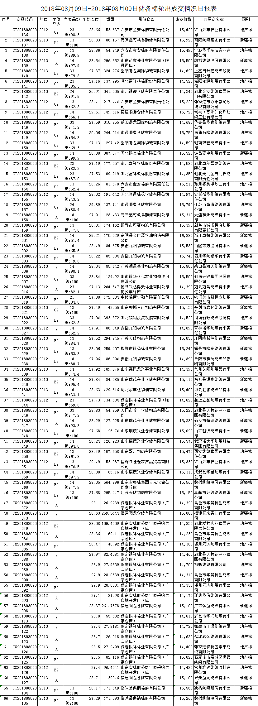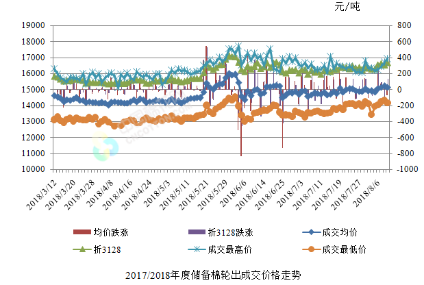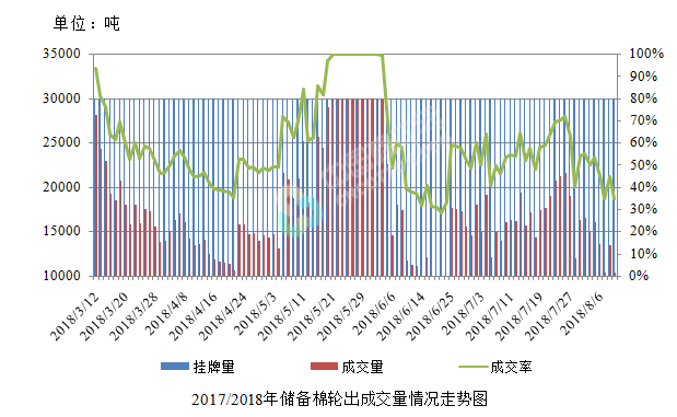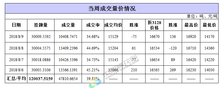 8月9日儲(chǔ)備棉輪出銷售資源30009.5592噸,實(shí)際成交10408.7471噸,成交率34.68%。平均成交價(jià)格15129元/噸(較前一日下跌75元/噸);折3128價(jià)格16670元/噸(較前一日上漲136元/噸)。