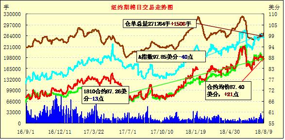 8月9日紐約期棉市場(chǎng)整體止跌反彈。1812合約結(jié)算價(jià)87.26美分,漲8點(diǎn);1903合約結(jié)算價(jià)87.69美分,漲22點(diǎn);1905合約結(jié)算價(jià)88.13美分,漲32點(diǎn)。其他合約上漲5-33點(diǎn)不等。當(dāng)日12月合約小幅低開(kāi),開(kāi)盤(pán)后因缺乏有利支撐交易重心走低,至當(dāng)日低點(diǎn)86.83美分處買(mǎi)盤(pán)入場(chǎng),市場(chǎng)受支撐走高,后在86.80-87.40美分區(qū)間震蕩運(yùn)行,最終一轉(zhuǎn)前兩日跌勢(shì),以微幅上漲收盤(pán)。據(jù)美國(guó)農(nóng)業(yè)部(USDA),2018/19年度(8.1-8.2)一周美國(guó)凈簽約出口2018/19年度陸地棉40061噸,陸地棉裝運(yùn)61870噸;凈簽約本年度皮馬棉4022噸;皮馬棉裝運(yùn)752噸;凈簽約2019/20年度陸地棉8953噸,皮馬棉5650噸。外圍美元指數(shù)上漲,玉米、小麥和大豆期貨下跌。美股收盤(pán)漲跌不一,納指連續(xù)第8個(gè)交易日上漲。