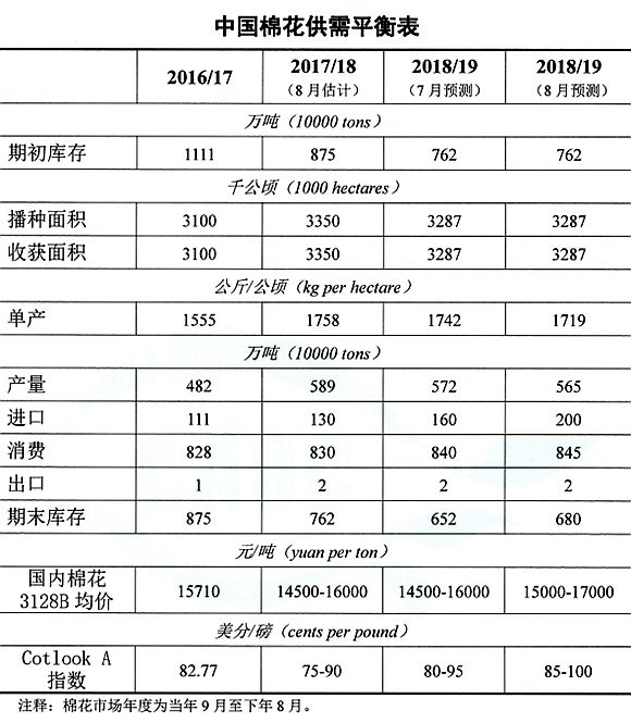 本月預(yù)測,2018/19年度中國棉花播種面積為3287千公頃,較上年度減少1.9%;單產(chǎn)為每公頃1719公斤,較上年度減少2.2%;總產(chǎn)量為565萬噸,較上年度減少4.1%。紡織品服裝出口形勢較為樂觀,預(yù)計(jì)棉花消費(fèi)量為845萬噸,較上年度增加1.8%。新年度中國棉花產(chǎn)需缺口明顯,預(yù)計(jì)棉花進(jìn)口量為200萬噸。預(yù)測2018/19年度國內(nèi)3128B級棉花均價(jià)在每噸15000-17000元區(qū)間,2018/19年度CotlookA指數(shù)均價(jià)在每磅85-100美分區(qū)間。