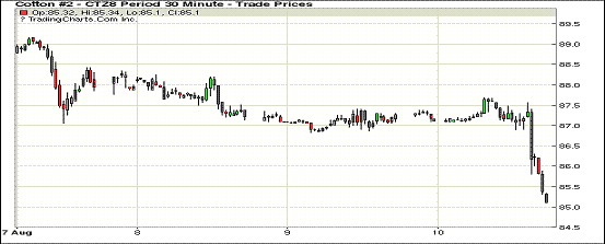 8月10日紐約期棉市場全面收跌。1812合約結(jié)算價85.23美分,跌203點;1903合約結(jié)算價85.71美分,跌198點;1905合約結(jié)算價86.17美分,跌196點。其他合約下跌79-185點不等。當(dāng)日12月合約平穩(wěn)開盤,整個上半場交易波瀾不驚,維持窄幅震蕩趨勢,在美國農(nóng)業(yè)部(USDA)8月份供需平衡表一經(jīng)發(fā)布,產(chǎn)量都有所調(diào)增,市場應(yīng)聲走低,出現(xiàn)斷崖式下跌,后在86.00-86.50美分區(qū)間震蕩運行,因缺乏有力支撐,跌幅加深,最終以大幅下跌收盤。外圍美元指數(shù)上漲,玉米、小麥和大豆期貨下跌。地緣局勢不確定性打擊投資者情緒,美股收盤全線下挫