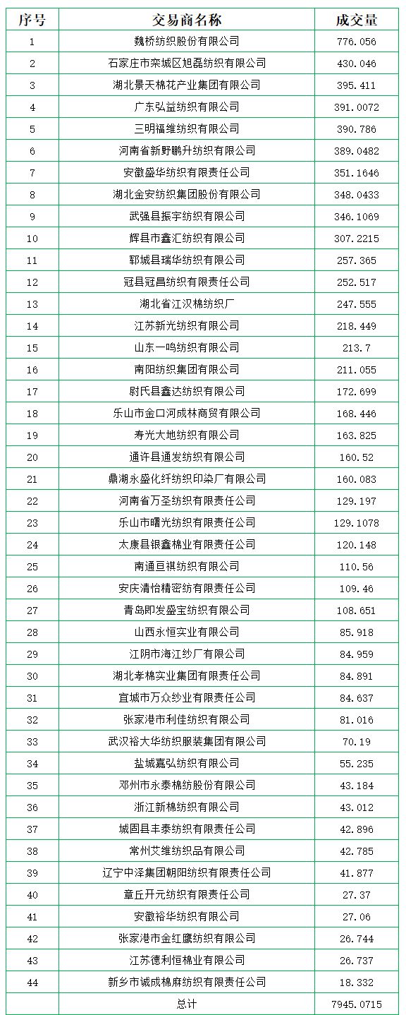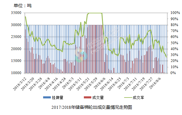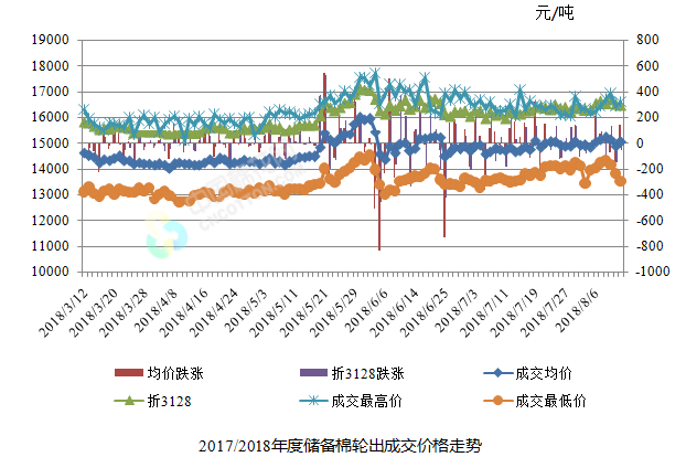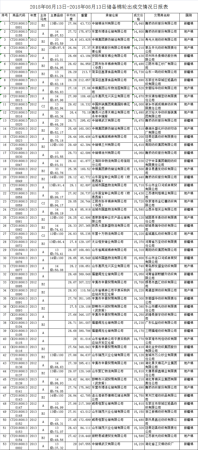 8月13日儲備棉輪出銷售資源30001.7167噸,實際成交7945.0715噸,成交率26.48%。平均成交價格15034元/噸(較前一日上漲146元/噸);折3128價格16470元/噸(較前一日下跌53元/噸)。
