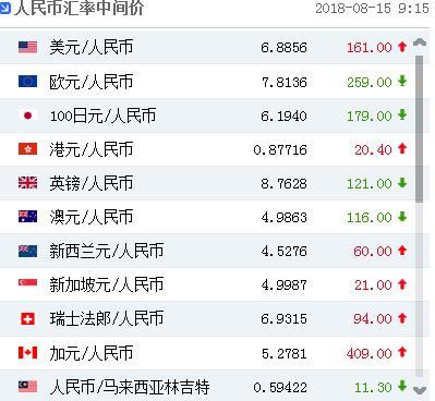 中國人民銀行授權(quán)中國外匯交易中心公布,2018年8月15日銀行間外匯市場人民幣匯率中間價為:1美元對人民幣6.8856元,1歐元對人民幣7.8136元,100日元對人民幣6.1940元,1港元對人民幣0.87716元,1英鎊對人民幣8.7628元,1澳大利亞元對人民幣4.9863元,1新西蘭元對人民幣4.5276元,1新加坡元對人民幣4.9987元,1瑞士法郎對人民幣6.9315元,1加拿大元對人民幣5.2781元,人民幣1元對0.59422馬來西亞林吉特,人民幣1元對9.6425俄羅斯盧布,人民幣1元對2.0717南非蘭特,人民幣1元對163.77韓元,人民幣1元對0.53297阿聯(lián)酋迪拉姆,人民幣1元對0.54421沙特里亞爾,人民幣1元對41.2853匈牙利福林,人民幣1元對0.55030波蘭茲羅提,人民幣1元對0.9536丹麥克朗,人民幣1元對1.3273瑞典克朗,人民幣1元對1.2211挪威克朗,人民幣1元對0.92520土耳其里拉,人民幣1元對2.7406墨西哥比索,人民幣1元對4.8317泰銖。