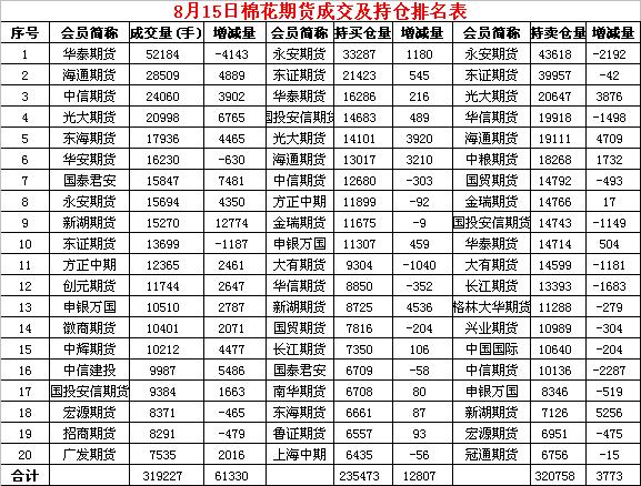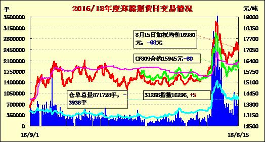 8月15日隔夜鄭棉反彈,今日早盤空頭賣盤壓制下走低,日線形成陰線。日內(nèi)成交量放大,持倉量增加?;久媲闆r:7月,中國棉紡織行業(yè)采購經(jīng)理人指數(shù)(PMI)為42.18%,環(huán)比下降6.91個(gè)百分點(diǎn),在50% 枯榮線之下,繼續(xù)走低。本月棉紗庫存增長,棉花庫存下降,開機(jī)率、生產(chǎn)量和新訂單量均出現(xiàn)下降。