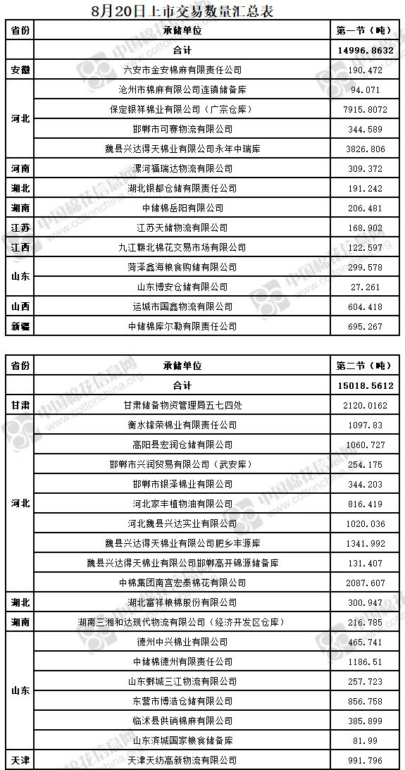 8月20日兩節(jié)共計(jì)輪出儲(chǔ)備棉30015.4244噸。第一節(jié)銷售儲(chǔ)備棉14996.8632噸,其中需要倒垛出庫69捆。第二節(jié)銷售儲(chǔ)備棉15018.5612噸,其中需要倒垛出庫73捆。