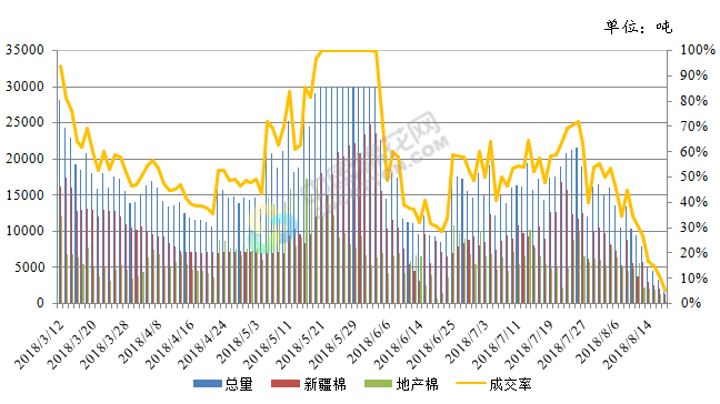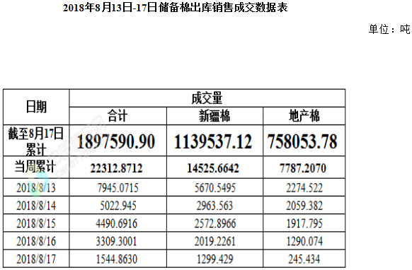 上周(2018年8月13-17日),2017/2018年度儲備棉輪出第二十三周,中國儲備棉管理有限公司上市交易儲備棉15萬噸,其中新疆棉2.4萬噸,地產棉12.6萬噸;實際成交2.23萬噸,成交率14.9%,新疆棉成交1.45萬噸,成交率60.4%,地產棉成交0.78萬噸,成交率6.2%。