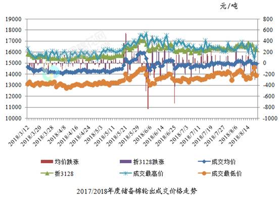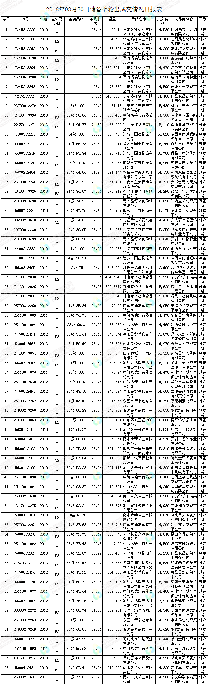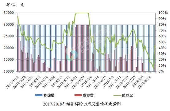 8月20日儲(chǔ)備棉輪出銷(xiāo)售資源30015.4244噸,實(shí)際成交13452.7噸,成交率44.82%。平均成交價(jià)格14959元/噸(較前一日下跌39元/噸);折3128價(jià)格16228元/噸(較前一日下跌106元/噸)。