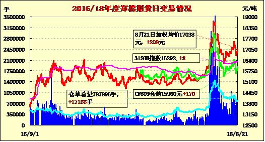 8月21日,隔夜鄭棉沖高后調(diào)整,今日早盤區(qū)間震蕩,午的一度下探,隨后在多頭買盤推動下放量回穩(wěn),日線形成陽線。日內(nèi)成交量放大,持倉量增加?;久媲闆r:近日,河北滄州連續(xù)遭受兩場強降雨,使棉花主產(chǎn)區(qū)的吳橋、東光、滄縣、鹽山以及青縣等地受澇嚴(yán)重。據(jù)實地了解,滄州的吳師傅說,他家種的1.7畝棉花全部被雨水浸泡。吳師傅表示,從現(xiàn)在情況看,今年當(dāng)?shù)孛藁▎萎a(chǎn)或大幅下降,部分地勢低洼棉田將會絕收。