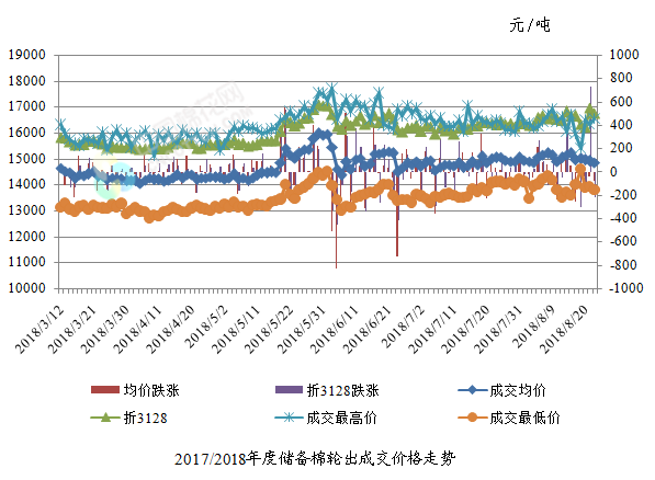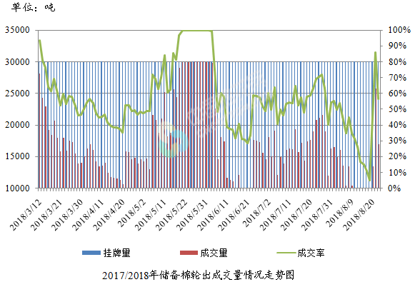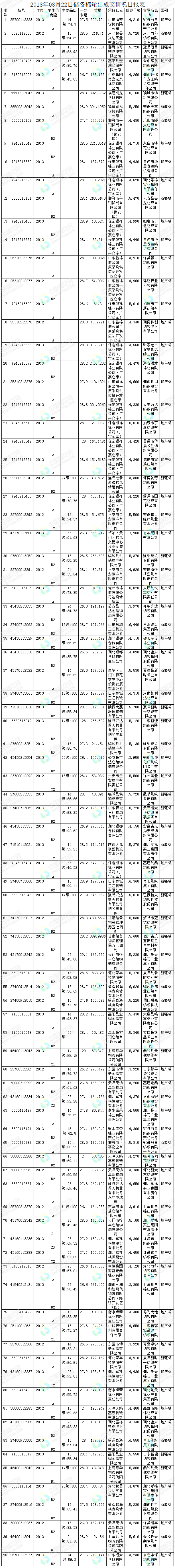 8月22日儲備棉輪出銷售資源30001.0264噸,實際成交16951.5169噸,成交率56.50%。平均成交價格14844元/噸(較前一日下跌75元/噸);折3128價格16745元/噸(較前一日下跌216元/噸)。