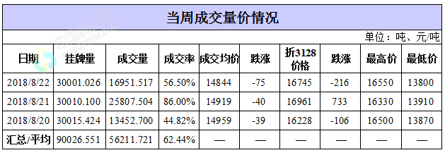 累計情況:截至8月22日,累計計劃出庫345.1萬噸,累計出庫成交195.4萬噸,成交率為57%;成交最高價17700元/噸,最低價12700元/噸。