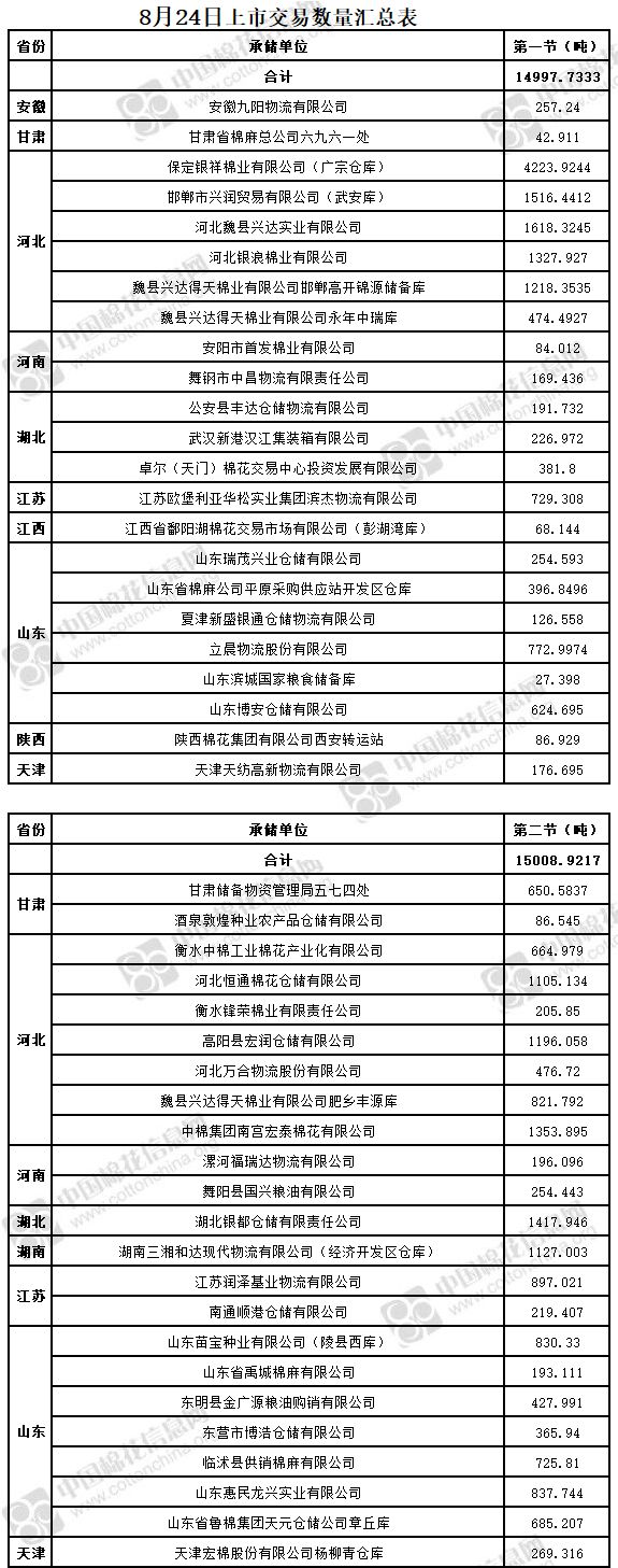 4、保定銀祥棉業(yè)有限公司(廣宗倉庫)(含部分包檢)、邯鄲市興潤貿(mào)易有限公司(武安庫)、河北魏縣興達實業(yè)有限公司、河北銀浪棉業(yè)有限公司(含部分包檢)、立晨物流股份有限公司、山東省棉麻公司平原采購供應(yīng)站開發(fā)區(qū)倉庫、魏縣興達得天棉業(yè)有限公司邯鄲高開錦源儲備庫(含部分包檢)、魏縣興達得天棉業(yè)有限公司永年中瑞庫(含部分包檢)為實施按批抽樣方式檢驗的承儲庫,由于掛牌較為集中,請買方妥善協(xié)商安排出庫。