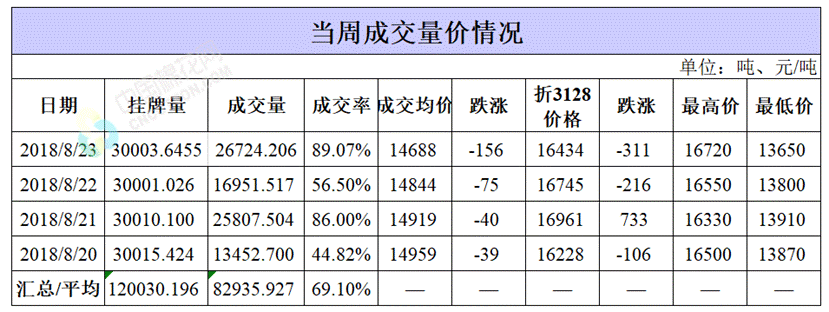 累計(jì)情況:截至8月23日,累計(jì)計(jì)劃出庫(kù)348.1萬(wàn)噸,累計(jì)出庫(kù)成交198.1萬(wàn)噸,成交率為57%;成交最高價(jià)17700元/噸,最低價(jià)12700元/噸。