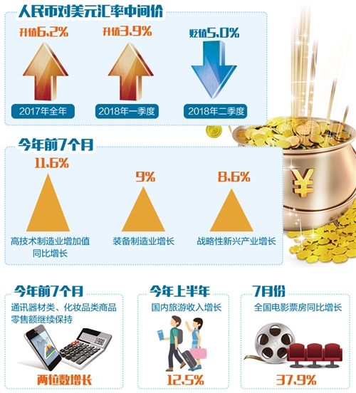 從供給方面來看,我國供給結(jié)構(gòu)在持續(xù)優(yōu)化。數(shù)據(jù)顯示,前7個月,高技術(shù)制造業(yè)增加值同比增長11.6%,裝備制造業(yè)增長9%,戰(zhàn)略性新興產(chǎn)業(yè)增長8.6%。從消費方面來看,消費升級態(tài)勢繼續(xù),前7個月通信器材類、化妝品類商品零售額繼續(xù)保持兩位數(shù)增長,上半年國內(nèi)旅游收入同比增長12.5%,7月份全國電影票房同比增長37.9%。從投資方面來看,投資結(jié)構(gòu)在優(yōu)化,制造業(yè)投資增速連續(xù)4個月保持回升,民間投資增速連續(xù)兩個月小幅回升。這些基本面的積極跡象對人民幣匯率構(gòu)成了正向支撐。