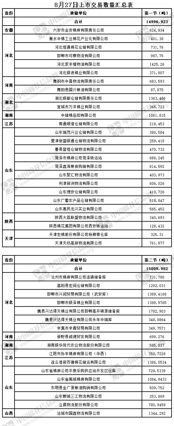 8月27日兩節(jié)共計(jì)輪出儲(chǔ)備棉30006.9050噸。第一節(jié)銷售儲(chǔ)備棉14996.923噸,其中需要倒垛出庫(kù)89捆。第二節(jié)銷售儲(chǔ)備棉15009.982噸,其中需要倒垛出庫(kù)59捆。