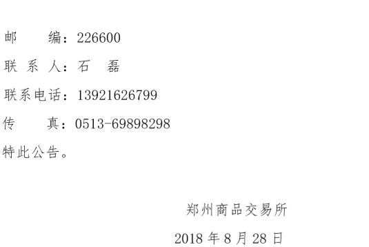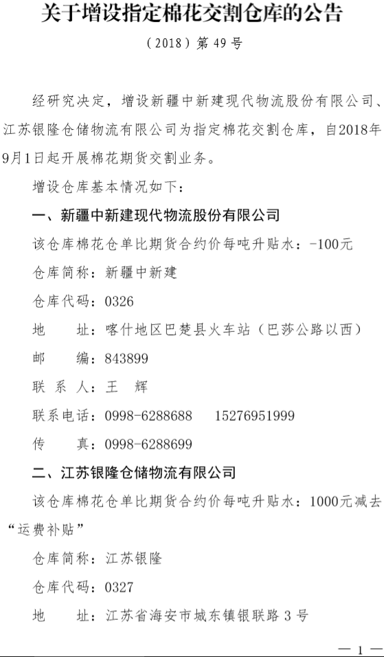 經(jīng)研究決定,增設(shè)新疆中新建現(xiàn)代物流股份有限公司、江蘇銀隆倉(cāng)儲(chǔ)物流有限公司為指定棉花交割倉(cāng)庫(kù),自2018年9月1日起開展棉花期貨交割業(yè)務(wù)。