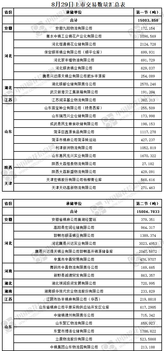 2、高陽縣宏潤倉儲有限公司、邯鄲市銀澤棉業(yè)有限公司、江陰市協(xié)豐棉麻有限公司(華西)、立晨物流股份有限公司、魏縣興達(dá)得天棉業(yè)有限公司邯鄲高開錦源儲備庫、河北魏縣興達(dá)實業(yè)有限公司(含部分包檢)、東營市博浩倉儲有限公司、辛集市辛?xí)x貿(mào)易有限公司(含部分包檢)、山東省棉麻公司平原采購供應(yīng)站開發(fā)區(qū)倉庫(含部分包檢)為實施按批抽樣方式檢驗的承儲庫,由于掛牌較為集中,請買方妥善協(xié)商安排出庫。