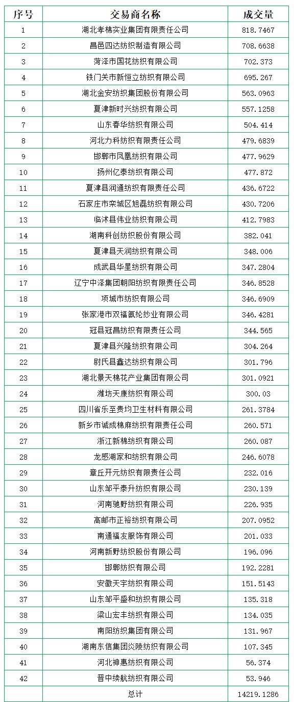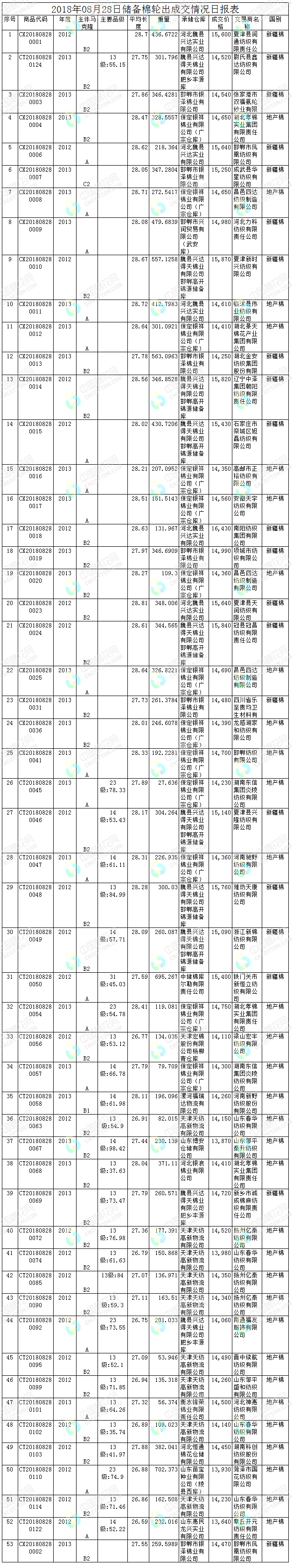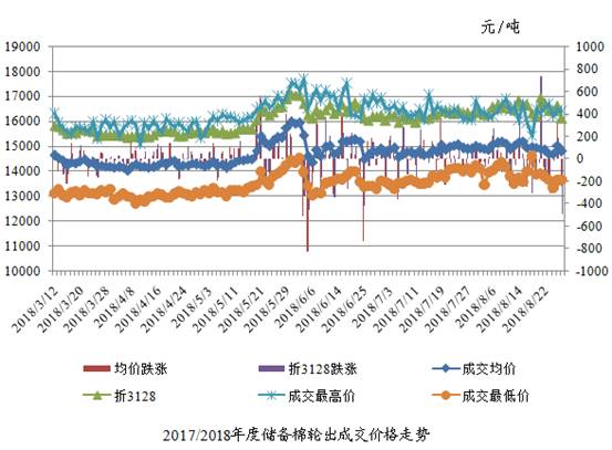 8月28日儲(chǔ)備棉輪出銷(xiāo)售資源30008.4833噸,實(shí)際成交14219.1286噸,成交率47.38%。平均成交價(jià)格14800元/噸(較前一日下跌237元/噸);折3128價(jià)格16113元/噸(較前一日下跌488元/噸)。