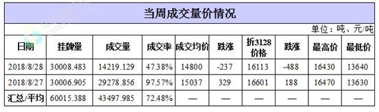 累計(jì)情況:截至8月28日,累計(jì)計(jì)劃出庫(kù)357.1萬(wàn)噸,累計(jì)出庫(kù)成交204.7萬(wàn)噸,成交率為57%;成交最高價(jià)17700元/噸,最低價(jià)12700元/噸。