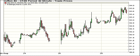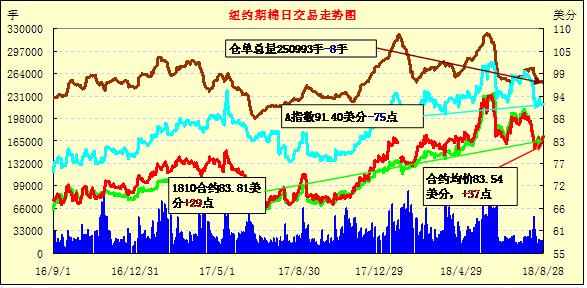 8月28日紐約期棉市場漲勢延續(xù)。1812合約結(jié)算價(jià)83.58美分,漲24點(diǎn);1903合約結(jié)算價(jià)83.85美分,漲33點(diǎn);1905合約結(jié)算價(jià)84.12美分,漲34點(diǎn)。當(dāng)日12月合約小幅低開,開盤后在82.80-83.00美分區(qū)間窄幅震蕩運(yùn)行,后買盤發(fā)力,交易重心受支撐上行,高點(diǎn)處賣盤入場,市場承壓走低,至當(dāng)日低點(diǎn)82.64美分處買盤入場,交易重心受支撐上行,至收盤處雖出現(xiàn)小幅回落,但最終延續(xù)前一日漲勢,以小漲收盤。雖然成交冷清,期棉依然保持上漲態(tài)勢。支撐棉價(jià)的利好因素主要以消息面為主,包括印度主產(chǎn)棉區(qū)古吉拉特迎來有利降雨;美國與墨西哥達(dá)成貿(mào)易協(xié)議,市場對于貿(mào)易摩擦的擔(dān)憂有所平復(fù);此外,美國政府請加拿大考慮加入美墨協(xié)議,據(jù)悉加拿大或?qū)⑴纱碛诒局芮巴绹M(jìn)行談判?;诿绹惹疤岢龅墓灿?jì)120億美元的農(nóng)業(yè)援助計(jì)劃,美國農(nóng)業(yè)部(USDA)公布了首批補(bǔ)貼清單及補(bǔ)貼標(biāo)準(zhǔn),將給予棉花0.06美元/磅的補(bǔ)貼。外圍美元指數(shù)下跌,玉米和大豆期貨下跌,小麥期貨上漲。