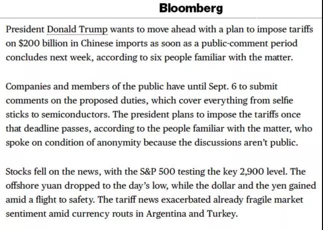 彭博援引6名知情人士的消息稱,美國(guó)總統(tǒng)唐納德·特朗普希望在下周的公共評(píng)論期結(jié)束后,盡快出臺(tái)一項(xiàng)計(jì)劃,對(duì)進(jìn)口自中國(guó)的2000億美元商品征收關(guān)稅。