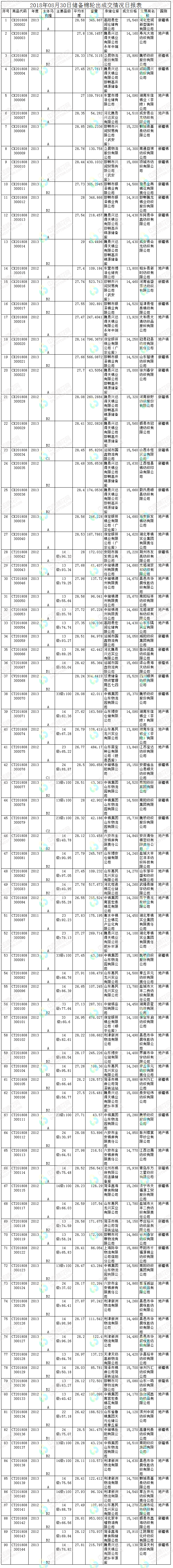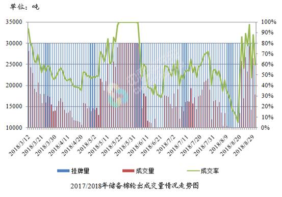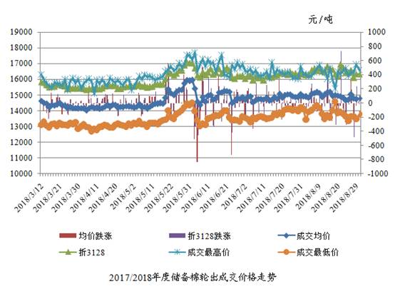 8月30日儲備棉輪出銷售資源30003.4148噸,實際成交17847.244噸,成交率17847.244。平均成交價格14791元/噸(較前一日上漲28元/噸);折3128價格16335元/噸(較前一日下跌10元/噸)。