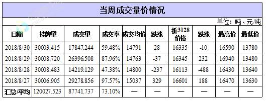 累計情況:截至8月30日,累計計劃出庫363.1萬噸,累計出庫成交209.2萬噸,成交率為58%;成交最高價17700元/噸,最低價12700元/噸。